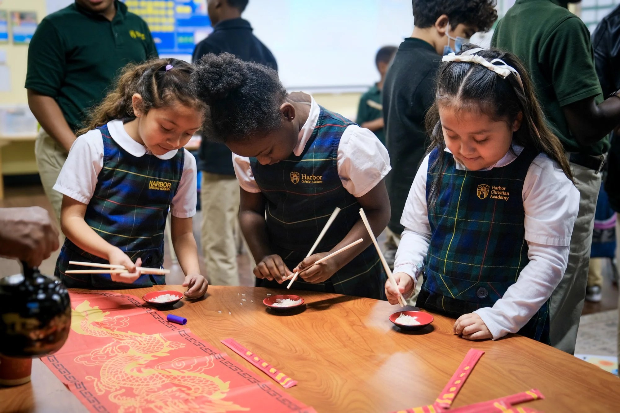 Since our fifth graders were also studying ancient China, I invited them to join our first grade class for a shared experience on the subject. Ms. Perlmutter and I collaborated on a lesson plan that would end with the students understanding more about ancient Chinese culture, traditions, values, and our shared religious beliefs. Both classes enjoyed the hands-on cultural experience, from exploring the definition of “tradition” to comparing ancient Chinese traditions with teachings from the Bible, to demonstrating appropriate etiquette when sampling food and drink. As students located China on a world map, Ms. Perlmutter also shared her knowledge, pictures, and stories from a recent visit to China. Our classes ended the collaborative time with the hands-on experience of eating rice with chopsticks and drinking tea, both staples in Chinese culture.